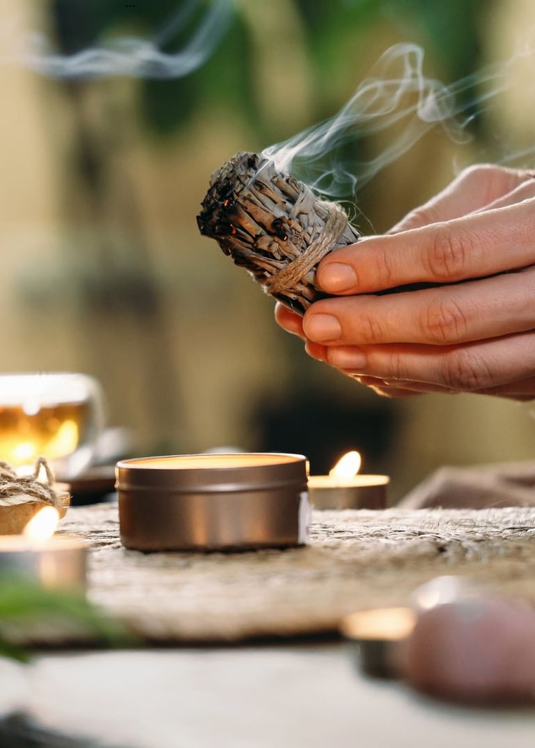 Als je een smudge stick (een bundel gedroogde salie) gebruikt, steek hem aan, laat hem kort branden en blaas vervolgens de vlam uit als je ziet dat hij begint te ‘roken’.